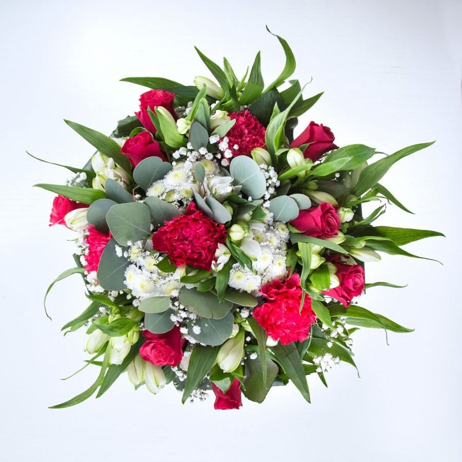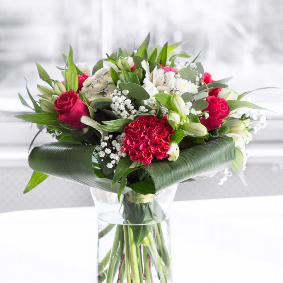 Revel in the magic of a bouquet that transforms any space into a haven of color and sophistication. This artfully designed arrangement boasts an inspiring mix of pure white chrysanthemums and ethereal gypsophila, combined with the rich hues of deep red roses and classic carnations. The addition of white alstroemeria and aspidistra leaves adds texture and depth to the overall design.